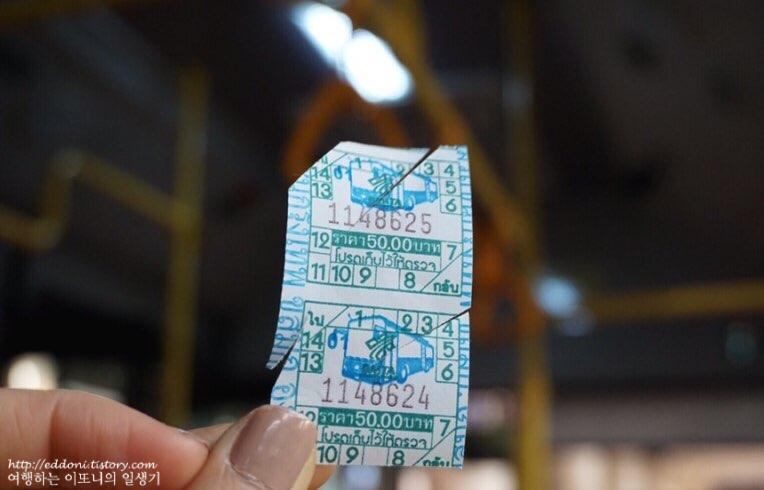 차가 출발하고 나서야 직원이 와서 티켓을 주었어요! 1인 50바트 2인 100바트를 내고 두장을 받았네요
