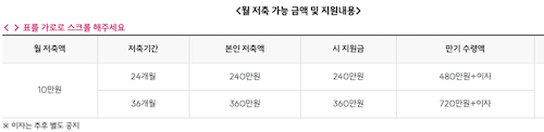 10만원 36개월 저축시 만기 720만원을 받을 수 있습니다.
