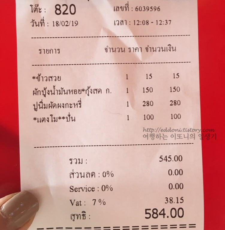 총 584바트나왔어요 Vat포함이라 따로 팁은 안드렸구요,