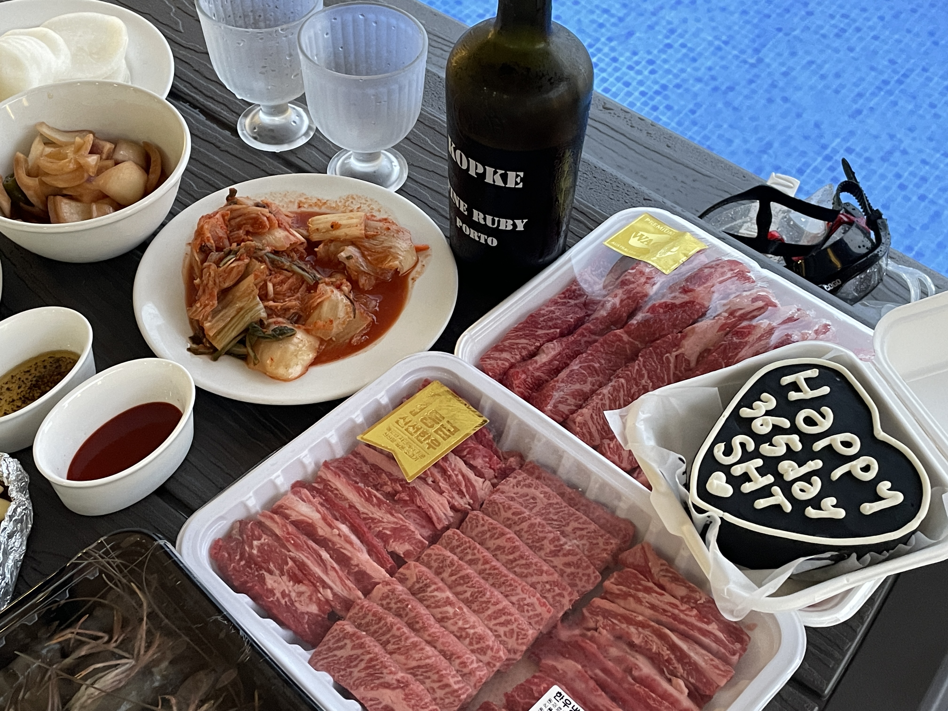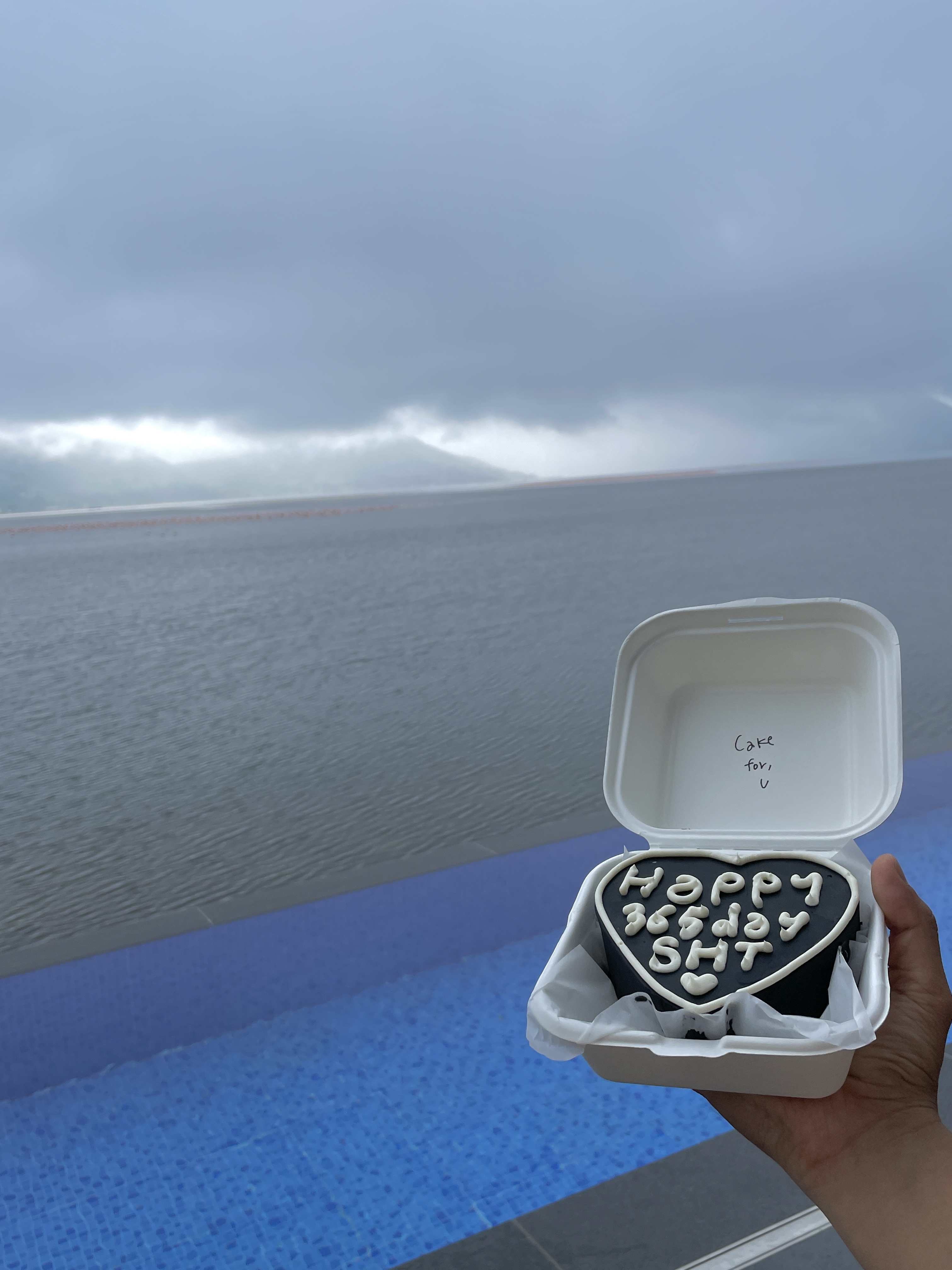 오자마자 풀빌라 뷰와 함께 찍은 레터링케이크